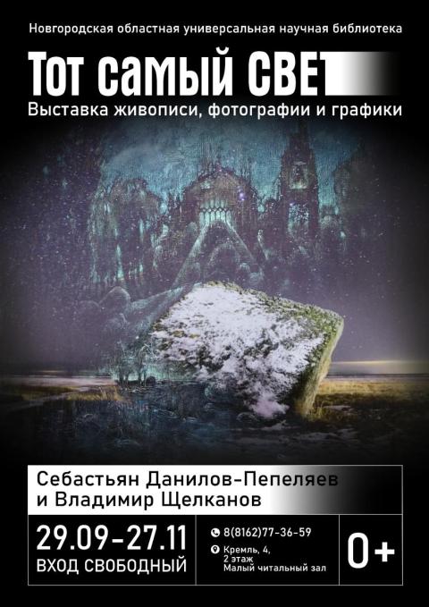 29 сентября в 16.00 в малом читальном зале Новгородской областной научной библиотеки (Кремль, 4) состоится открытие двойной персональной выставки "Тот самый свет", организованной художником Себастьяном Даниловым-Пепеляевым и фотографом Владимиром Щелкановым.